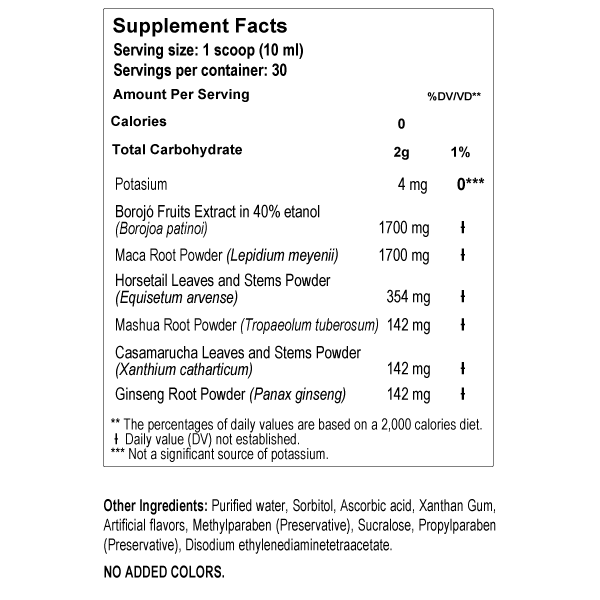 Formulado con ingredientes como ginseng, mashua, cashamarucha, borojó, maca y cola de caballo.