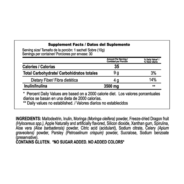 Fórmula enriquecida con una nutritiva mezcla de moringa, pitahaya liofilizada (fruta del dragón), apio y perejil, lo que la convierte en una excelente opción para la salud en general*.