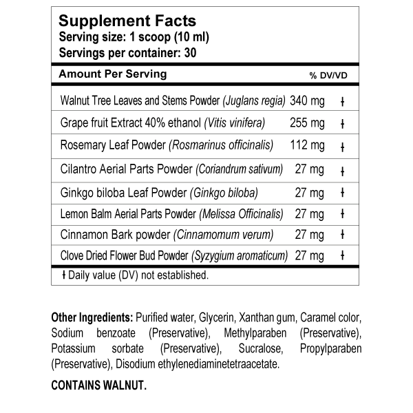Su fórmula exclusiva incluye hojas de nogal, extracto de uva, romero, cilantro, ginkgo biloba, melisa, canela y clavo. Cada uno de estos componentes ha sido seleccionado por sus beneficios antioxidantes, que ayudan a combatir el estrés oxidativo y a promover un equilibrio óptimo.