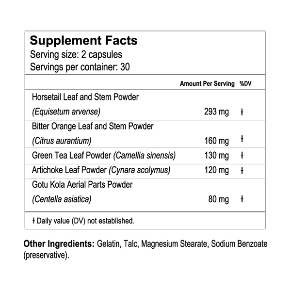 | Ingredientes: | COLA DE CABALLO: Diurético, elimina toxinas. |
